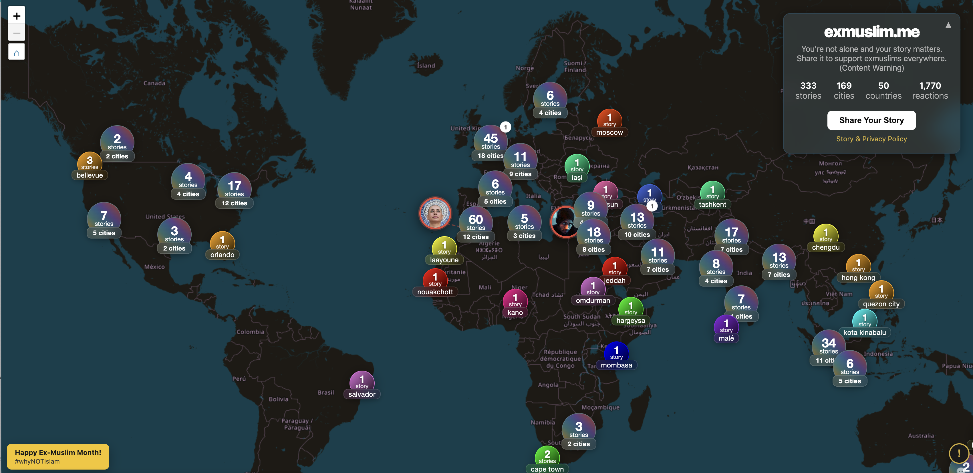 If you haven’t yet, explore exmuslim.me — the first global map of Ex-Muslim stories, shared anonymously by people who’ve left Islam. This week, the project also introduced new ways to engage with these stories: Shuffle, which randomly surfaces a single account from anywhere in the world, and Reactions, allowing readers to acknowledge and support individual stories.
